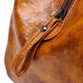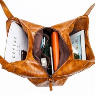Principais características: fecho de imãs, couro com acabamento, costura reforçada e bolsos grandes.