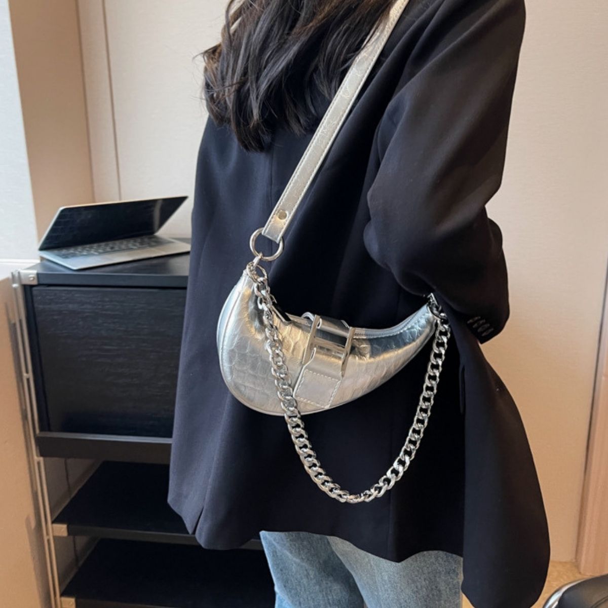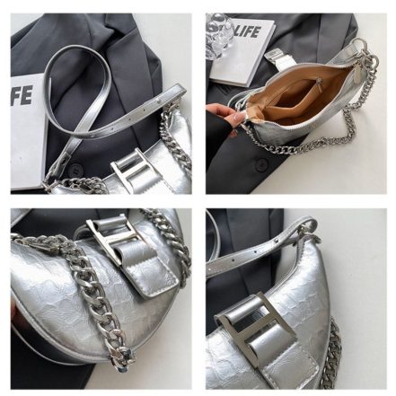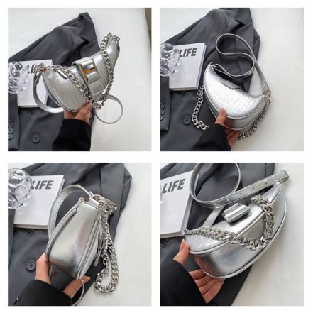 Seja o centro das atenções com uma bolsa exclusiva, mostrando ao mundo que você está um passo à frente quando se trata de tendências. Abra espaço para a criatividade e mergulhe nessa nova era da moda, onde o metalizado em conjunto com a simetria são a chave para a expressão da individualidade!