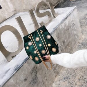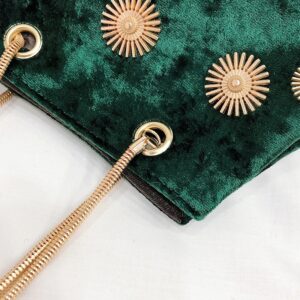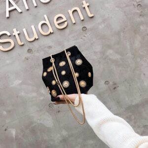 Seus detalhes especiais e delicados de tachas douradas circulares conferem um toque de sofisticação, enquanto a alça de corrente estilo “rabo de rato” adiciona um charme extra, além de ser ajustável, permitindo que você a use tanto de forma curta quanto longa e transversal.