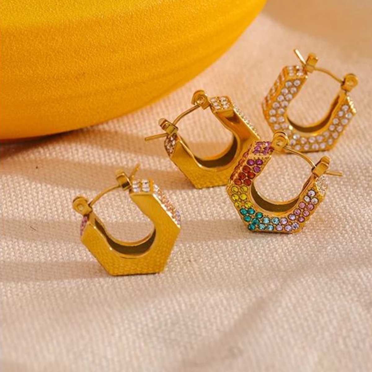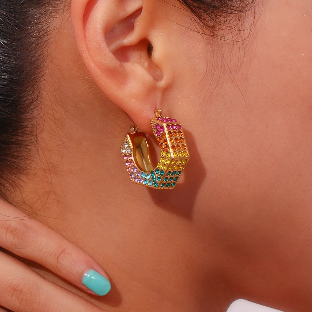 Desfrute da versatilidade com duas opções de design deslumbrantes. Escolha entre um par de brincos cravejados em zircônias brilhantes brancas para um visual clássico ou opte pelas zircônias coloridas para uma explosão de vivacidade.