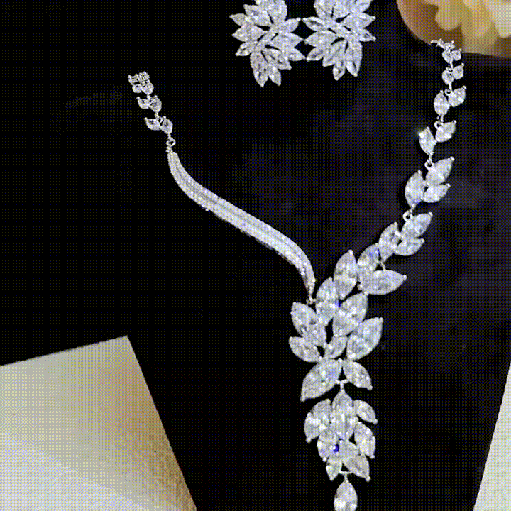 Trabalhado em pedras lapidadas tipo diamante, o luxuoso Conjunto Feminino de Colar e Brincos Gorgeous Woman é o acessório indispensável para a mulher que deseja se destacar em uma ocasião especial. Ideal para quem busca por qualidade e elegância em uma semijoia incrível, super versátil e que consegue trazer elegância para qualquer visual básico. Confeccionado em cobre antialérgico e cravejado com zircônias cúbicas, tem um design encantador com curvas suaves de folhas que garantem um toque romântico a produção.