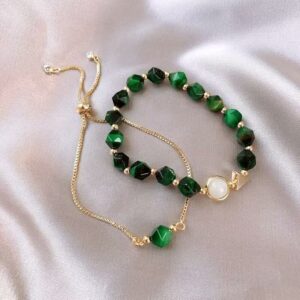 Juntas, o Jaspe Verde e a Opala criam um conjunto de pulseiras que não apenas exala elegância natural, mas também transmite uma sensação de beleza única e majestosa.