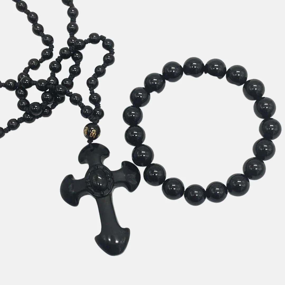 Pacote: 01 crucifixo com corrente de contas e 01 pulseira elástica
