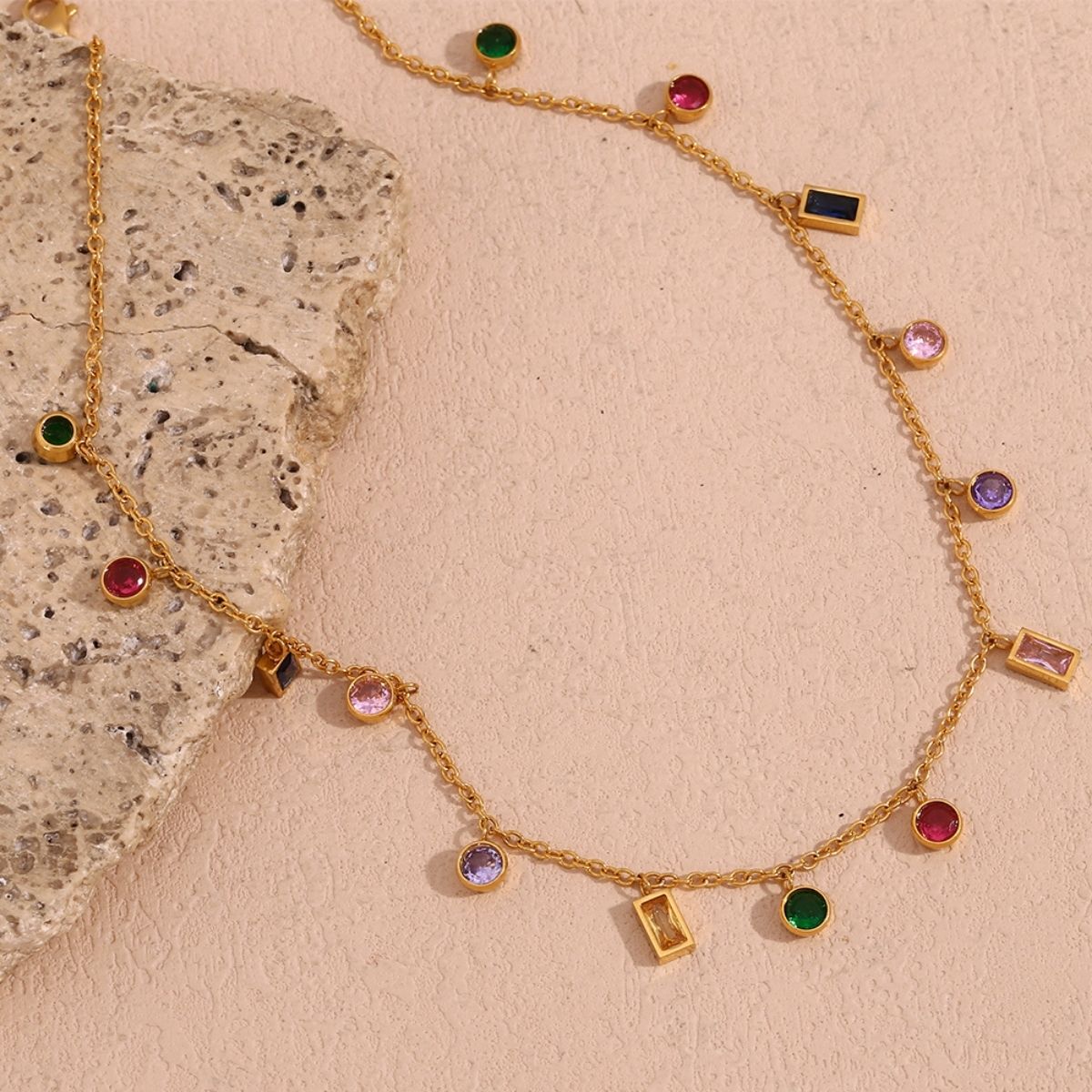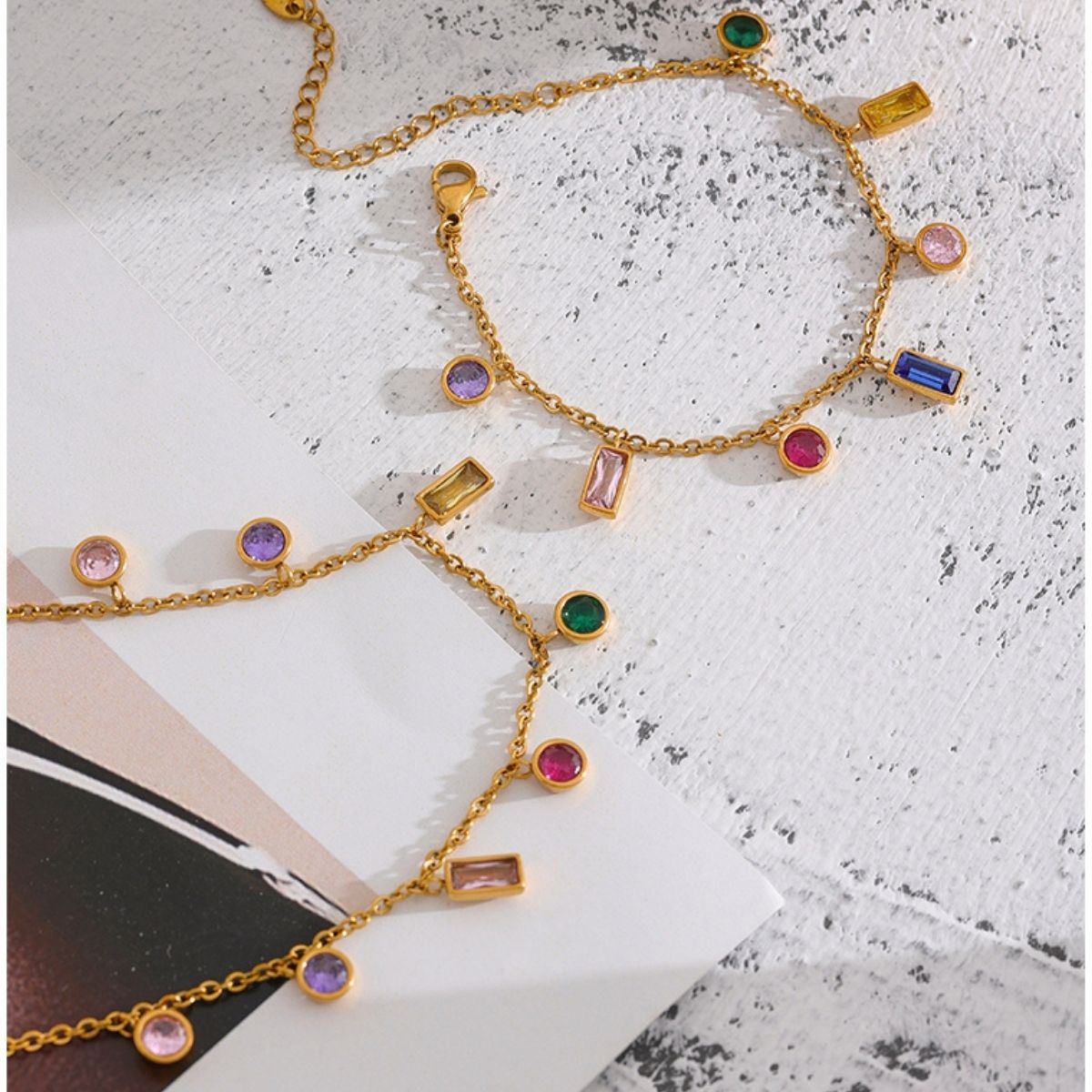 Forjado em aço inoxidável Banhado a Ouro 18k, ele confere durabilidade e brilho excepcional, enquanto as zircônias coloridas lapidadas em diversas formas adicionam um toque de vivacidade e personalidade.
