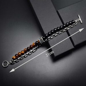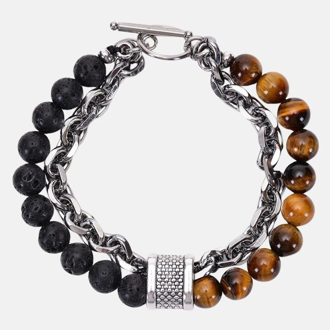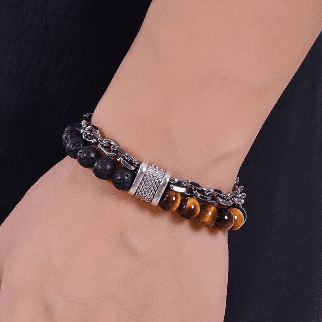 Com um material de qualidade e um design invejável, o estilo da pulseira dupla Vitale representa perfeitamente o bom gosto e o cuidado com a estética masculina através da combinação entre o clássico e o moderno das contas feitas em pedras naturais e da corrente de aço inoxidável.Pulseira Dupla “Vitale” – Em Rocha Vulcânica, Olho de Tigre e Aço InoxidávelAs Pedras naturais podem proporcionar vitalidade física e mental enquanto os acabamentos em aço inoxidável dão um toque de modernidade e versatilidade.