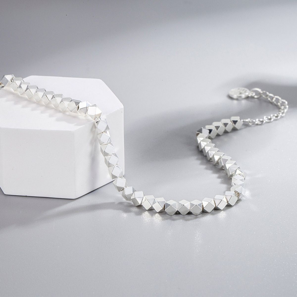 A Pulseira Luminar foi elaborada com precisão em prata esterlina de alta qualidade. Seu design exclusivo apresenta pequenos dodecaedros que, na geometria sagrada, capturam a essência do elemento éter, associado ao despertar espiritual.