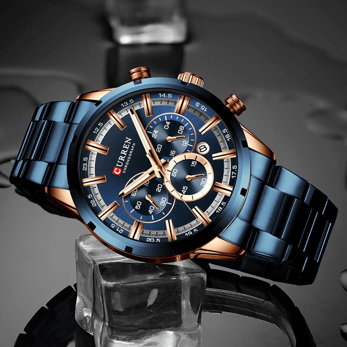 O Sea Rose possui uma combinação de cores que certamente chamará a atenção das pessoas que estiverem ao seu redor. Um relógio quase inteiramente azul, porém com detalhes em ouro rose que transformam esse item em algo ainda mais luxuoso. Um produto chamativo, que com certeza trará um “up” para o estilo do homem que usar.