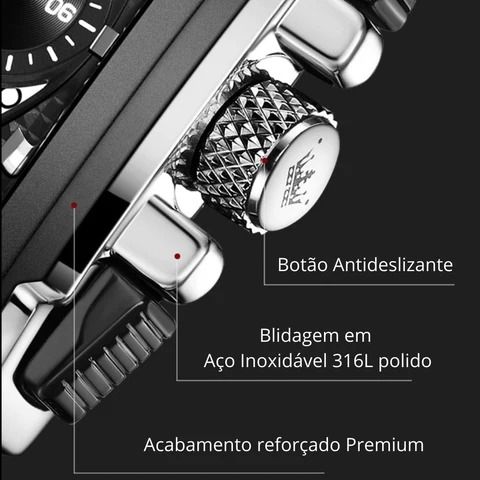 O botão principal desse relógio possui um acabamento primoroso, além de sua extremidade ser antideslizante o centro possui uma coroa gravada, para você demonstrar o verdadeiro luxo de um rei!