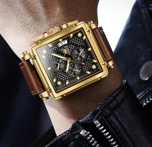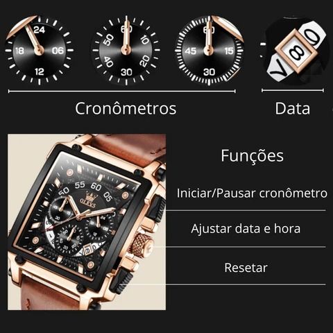 Um exclusivo relógio que foge do padrão, com um formato e design totalmente inovador, mas sem abrir mão do estilo clássico e da sofisticação que você merece. O Relógio Masculino Quadrado é repleto de detalhes, sua construção é feita com alta qualidade trazendo assim luxo, longa durabilidade, com a qualidade e a garantia que você precisa. Esse relógio é extremamente completo, feito de aço inoxidável 316L e um resistente couro, possui vidro blindado anti-risco, movimento a quartzo, luz noturna, calendário e 3 diferentes tipos de cronômetros além de ser à prova d’água e choque. Tudo desenvolvido para você que quer um acessório premium de verdade!