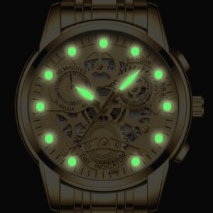 Todo feito em aço inoxidável 316L, este acessório é resistente à abrasão e a água, além de possuir ponteiros luminosos e mostradores funcionais. Se destaque na multidão com o Golden King, o relógio perfeito para homens de bom gosto.