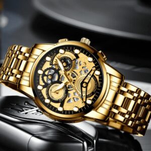 O Golden King é um símbolo de Poder, Elegância e Luxo. Os traços marcantes desse relógio masculino premium fazem com que seja desejado por homens poderosos que sabem que um bom acessório pode fazer toda a diferença. Dourado e resistente à água, possui toda a qualidade que você, homem moderno, deve exigir de um acessório de luxo, mas por um preço super acessível!