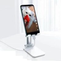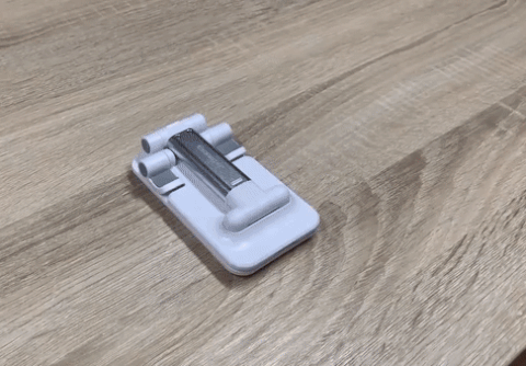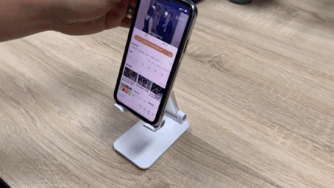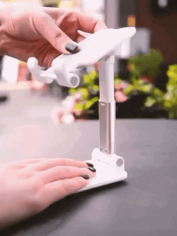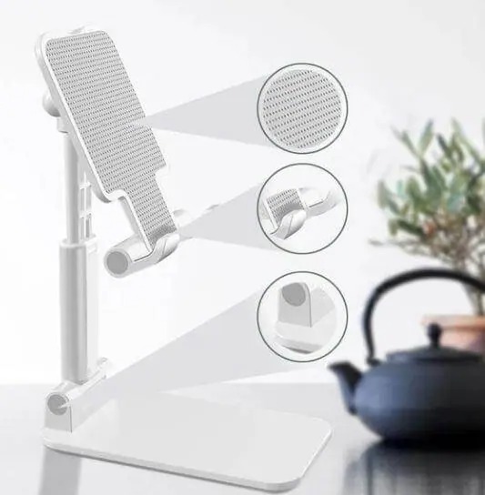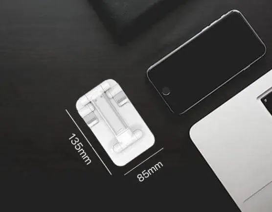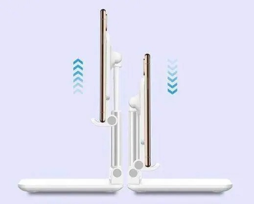 Trata-se de um suporte para telefone e tablet que pode ser dobrado sem montagem, pode ser transportado e possui ajuste de vários ângulos.