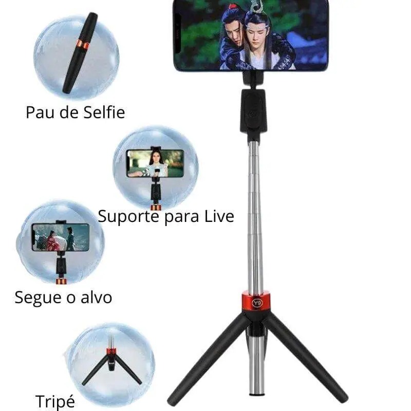 O Tripé Flexível para Celular 3 em 1 com Controle Remoto Bluetooth é revolucionário pois pode ser usado de três formas: Pau de Selfie (selfie stick), Suporte para Lives e, especialmente, a Perseguição.