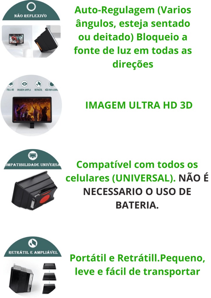 VISUALIZAÇÃO HD: Este aparelho pode aumentar de 6 a 8 vezes a tela do seu celular e fornecer imagens em HD nítidas e cristalinas, proporcionando excelente experiência de visualização!